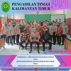 Ketua Pengadilan Tinggi Kalimantan Timur (Bp. Sutoyo, S.H., M.Hum.) bersama dengan Sekretaris (Bp. H. Murtaji, S.E., S.H., M.H.), Hakim Tinggi (Bp. Bambang Kusmunandar, S.H., M.H.), dan Kasub Kepegawaian dan TI (Bp. Harianto Effendi, S.Sos.) mengunjungi Pengadilan Negeri Tanah Grogot untuk melakukan Pembinaan/Pengawasan Pelayanan Publik yang dilaksanakan Hari Kamis dan Jumat (3 s.d. 4 Februari 2022).